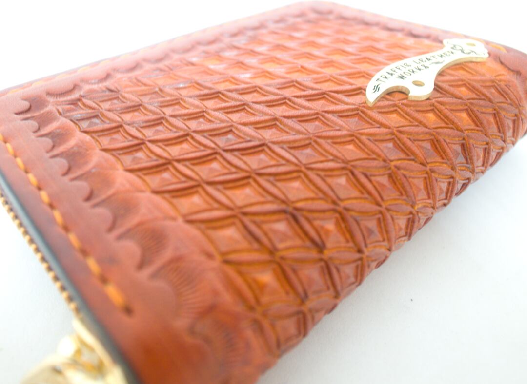 手染めにて風合い有るレザーを使用し、ハンドワークで丁寧に柄を打ち込んだ作品です。手の平サイズですのでお札なども入れてセカンド財布としてもご利用いただけます。 ※こちらの商品は職人のハンドメイドです。