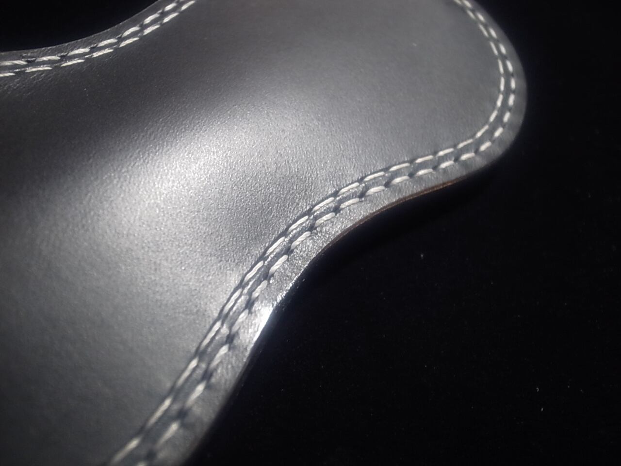 全ての工程を手作業にて作成し既製品ては使わない3mmのレザーを張り合わせコインポケット部分は9mm厚を縫い上げ