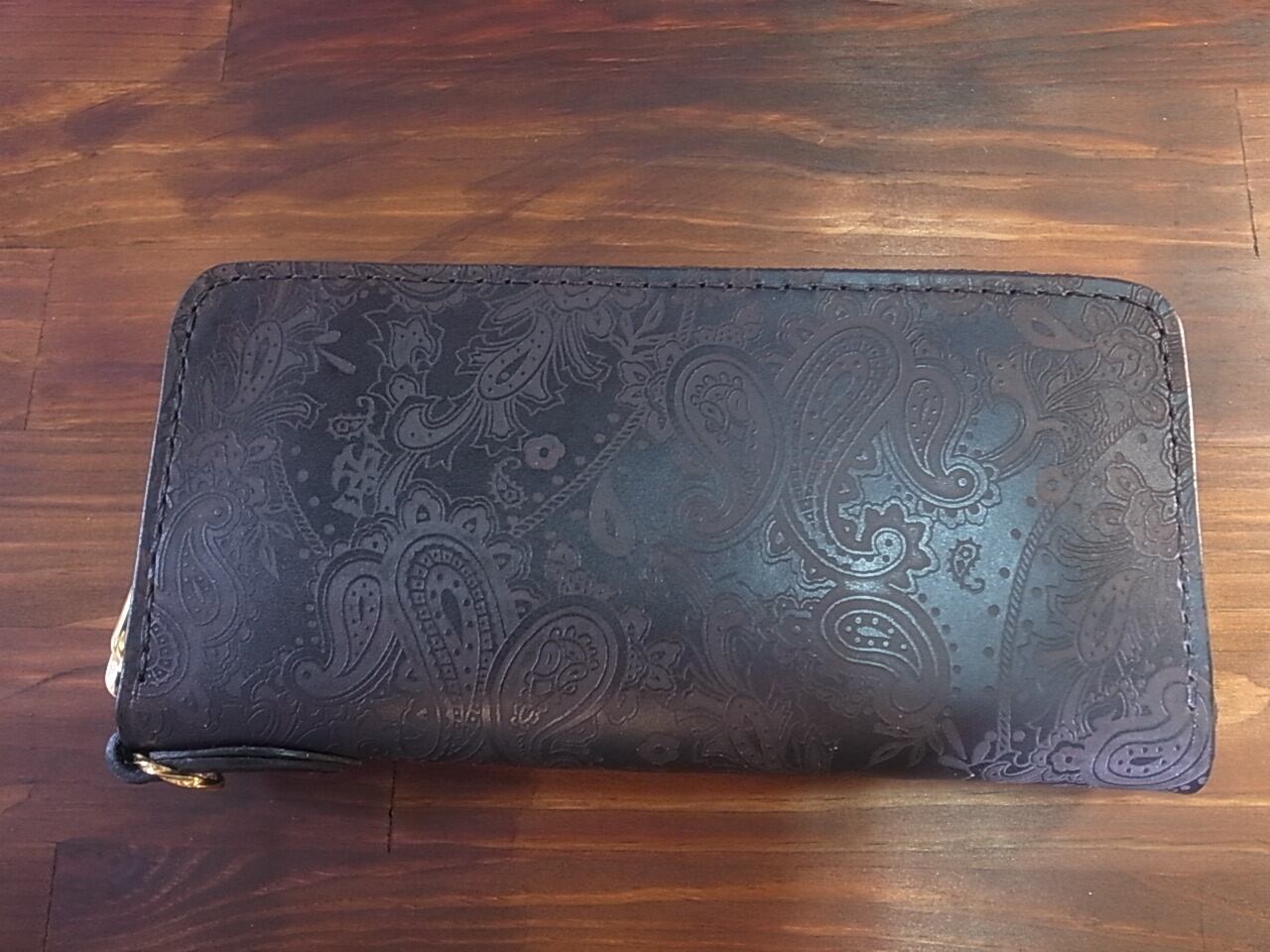 外部はペイズリー柄の焼印を施し、内部はカードを12枚収納可能にし、小銭を入れなども工夫を凝らしレザーライニングを貼り合わせてますので、ファスナーに小銭が下まで落ちない用に浅くて縫い上げマチを装着している為に小銭の取りやすさにも配慮してます。