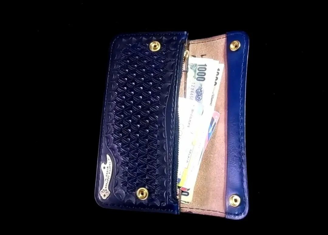 手作り品にこだわった、職人技が光るトラッカーズウォレット。ロングタイプなので、たっぷりとカードやお札を収納できます。スタンプワークは職人が一つ一つ丁寧に打ち込んでおり、その深みと美しさに思わずうっとり。手縫いで仕上げられた縫い目は、丈夫で長持ちすることも魅力。さらに、手染めで施された色合いは絶品です。