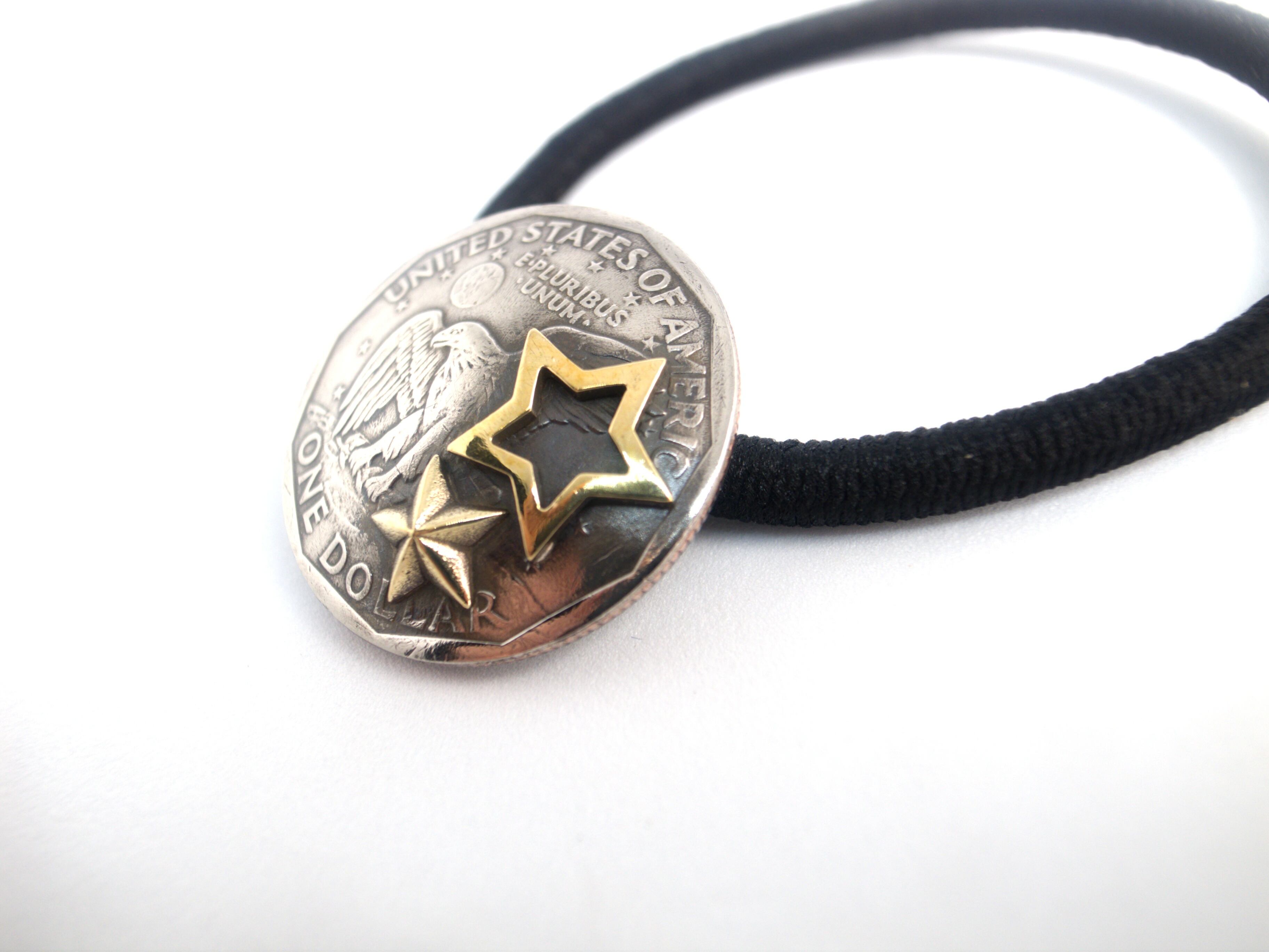 スターのモチーフが可愛らしいヘアゴムです。髪をまとめるだけでなく、ブレスレットとしてもお使いいただけます。どんなヘアスタイルにも合わせやすく、おしゃれなアクセントになりますよ。シンプルでありながら個性的なデザインは、あなたのスタイリングをぐっと引き立てます。