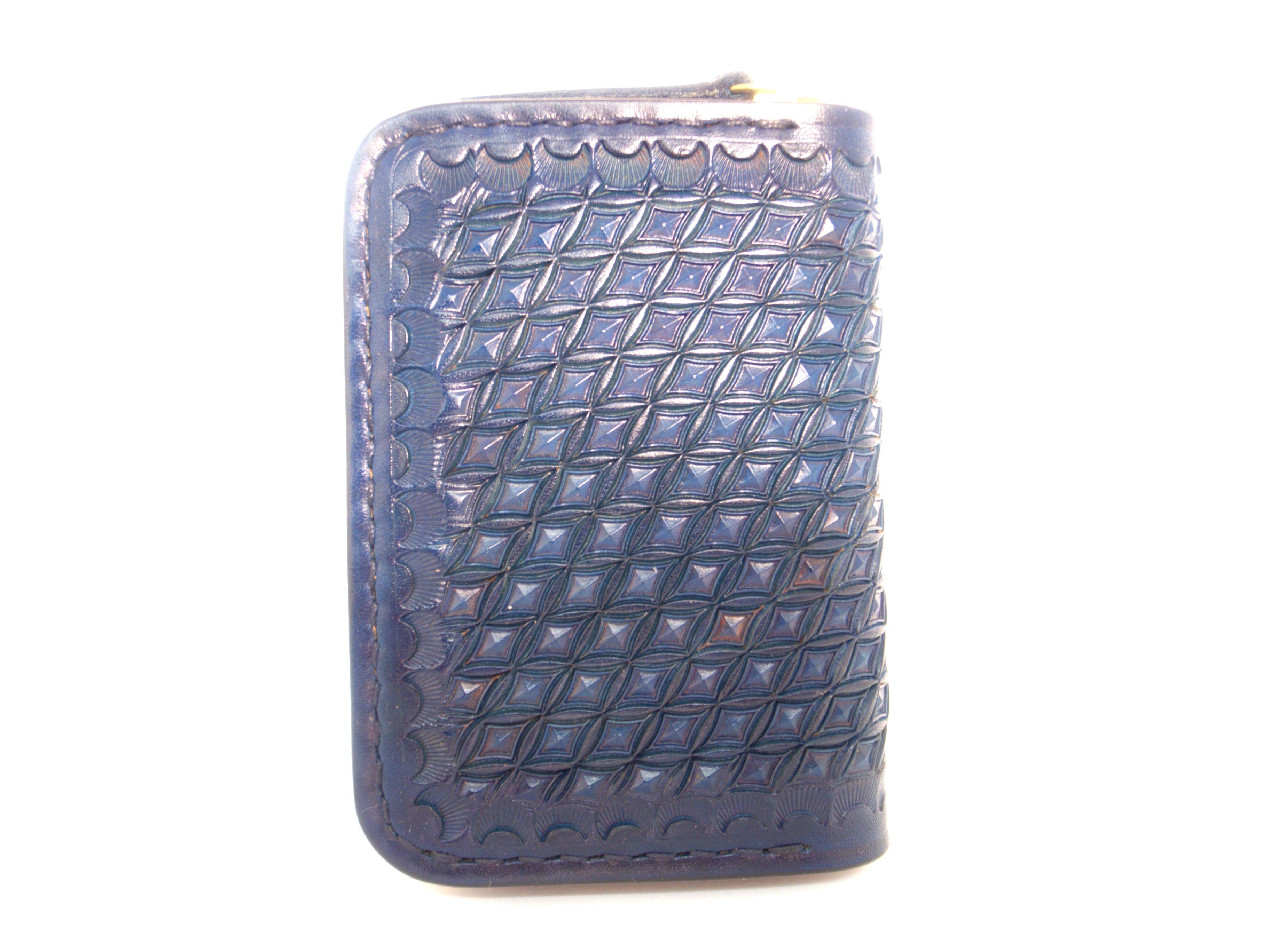 手染めにて風合い有るレザーを使用し、ハンドワークで丁寧に柄を打ち込んだ作品です。手の平サイズですのでお札なども入れてセカンド財布としてもご利用いただけます。 ※こちらの商品は職人のハンドメイドです。