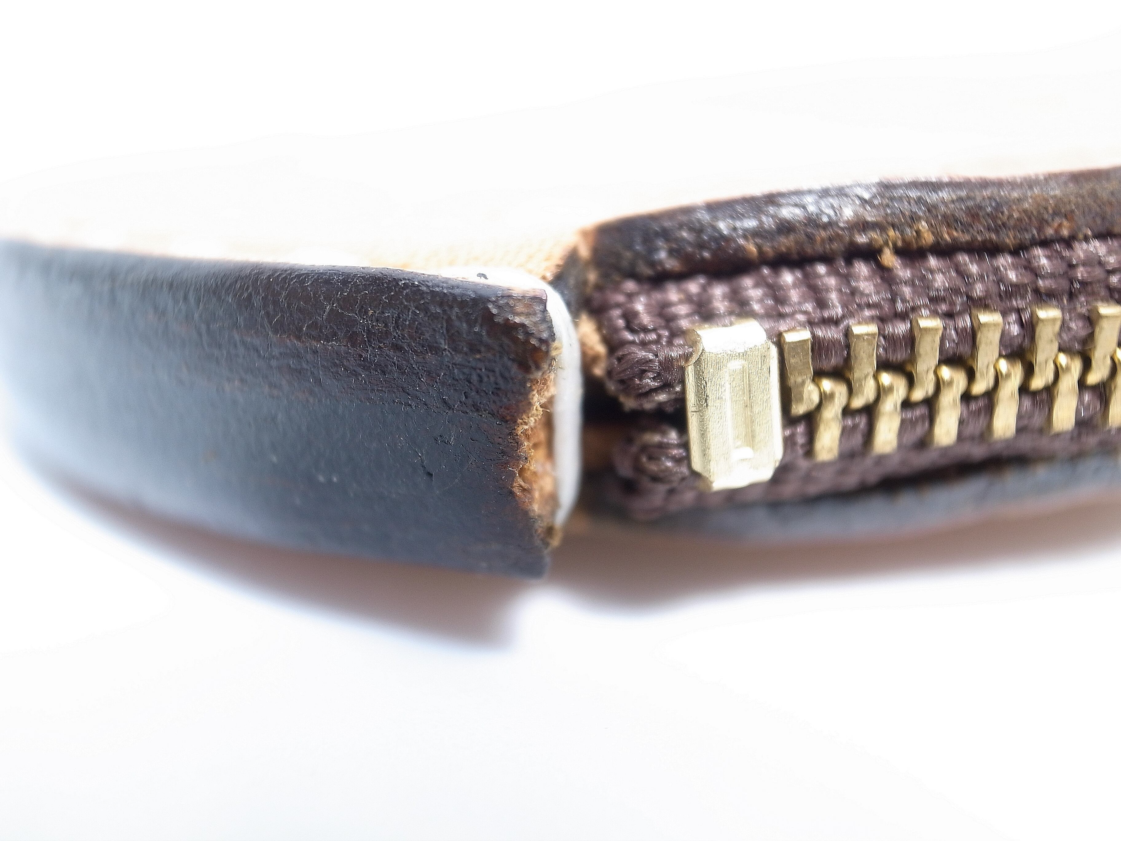 コインが引っ掛かることなくスムーズに取り出せるファスナーのナイロンと強度とレザーライニングを施し、ファスナーの高さを合わせる重ねレザーを手縫い