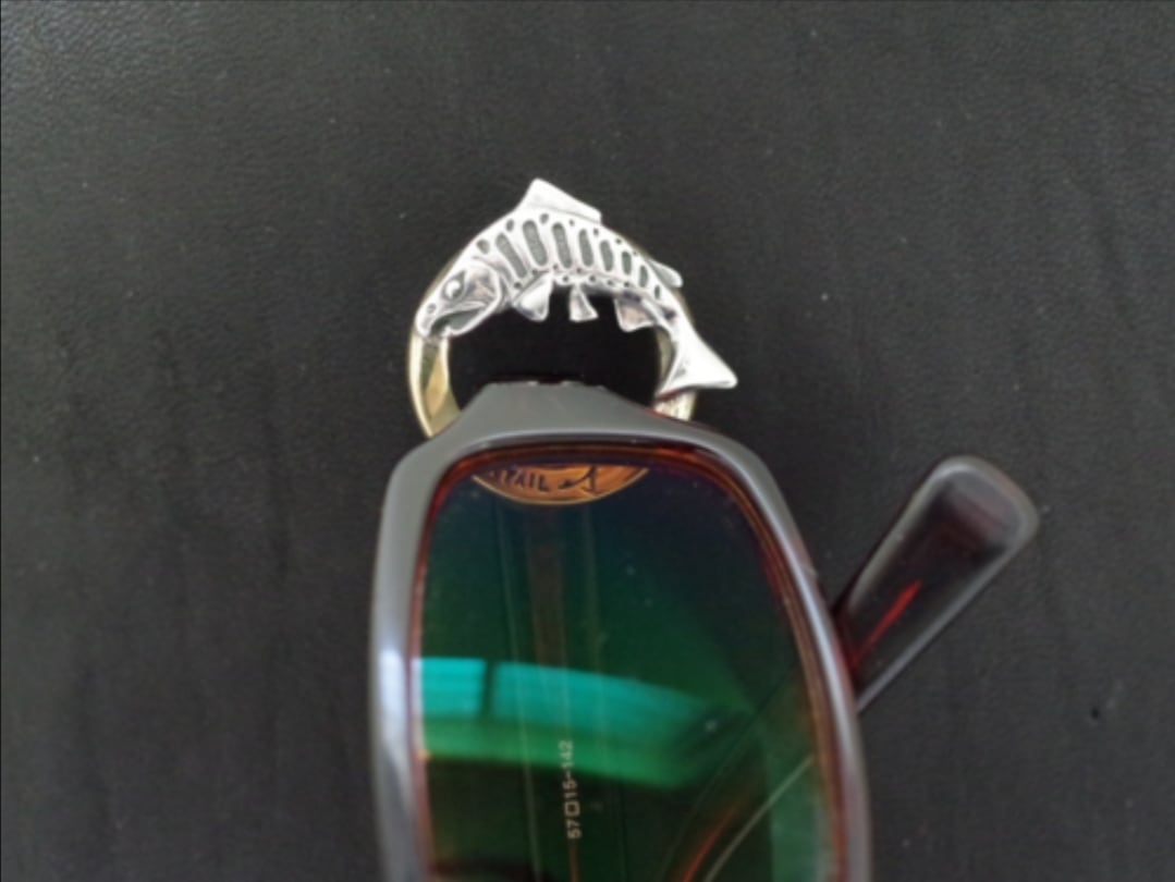 柔らかい曲線が特徴の前モデルとは対象的にエッジの効いた上品な仕上がりとなりました。 平面形状ですがハンドメイドならではの微妙な凹凸で動きを出しています。 シルバーとブラスのコンビ。 釣り場での撮影時、偏光グラスをポケットに入れたり地面に置くのは傷がつきそうで…。 そんな時役立つピンズタイプのグラスホルダー。