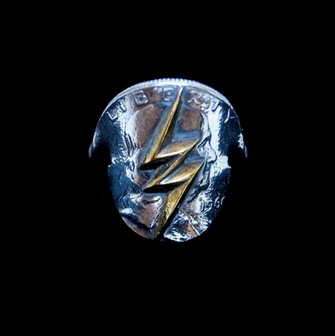リアルコインを切り出して真鍮のサンダーを貼り付けてオールド感を出しつつスーツスタイルにもはまると作成致しました。